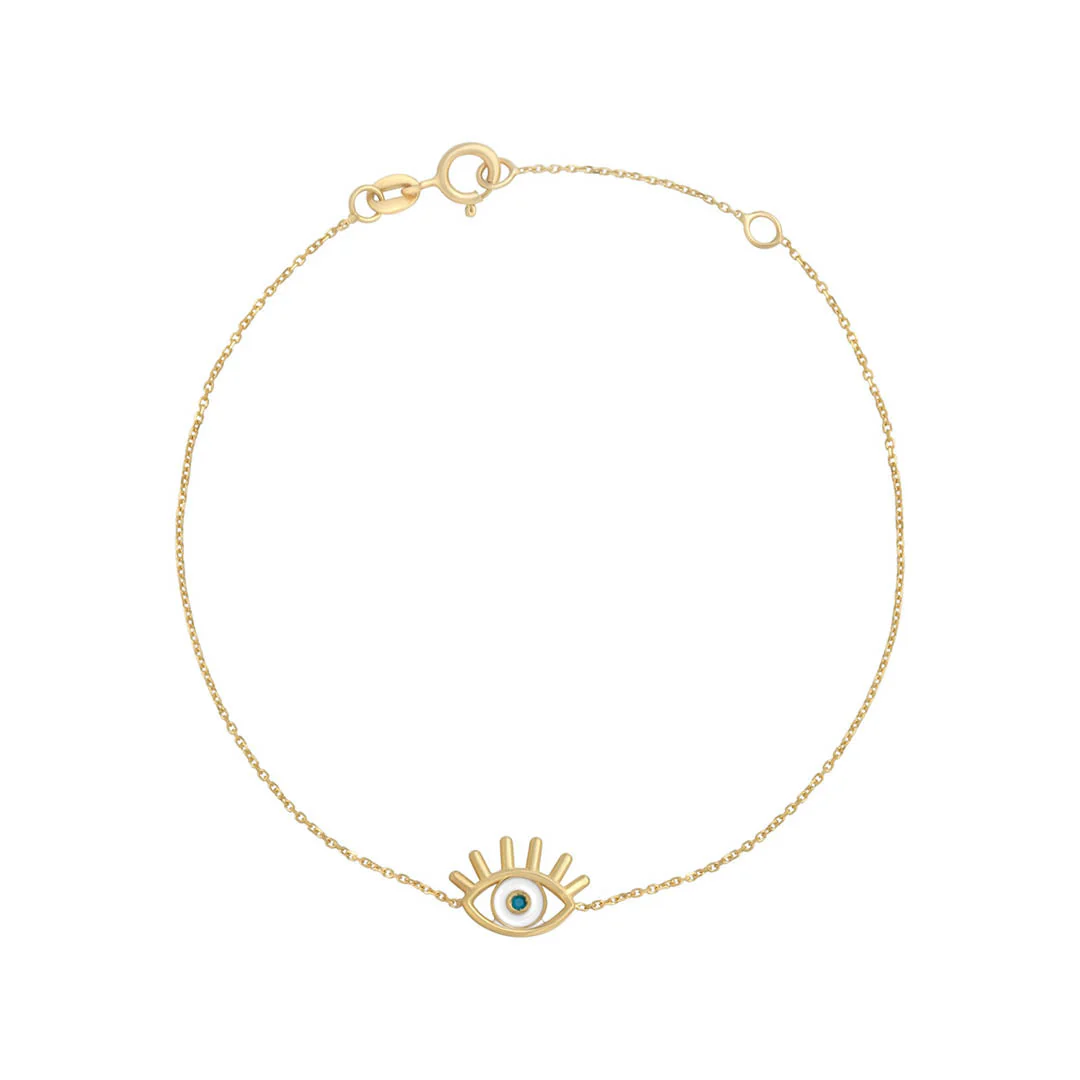 Description: This gold enamel evil eye bracelet features a white enamel evil eye. Originating from ancient Greece, the evil eye...