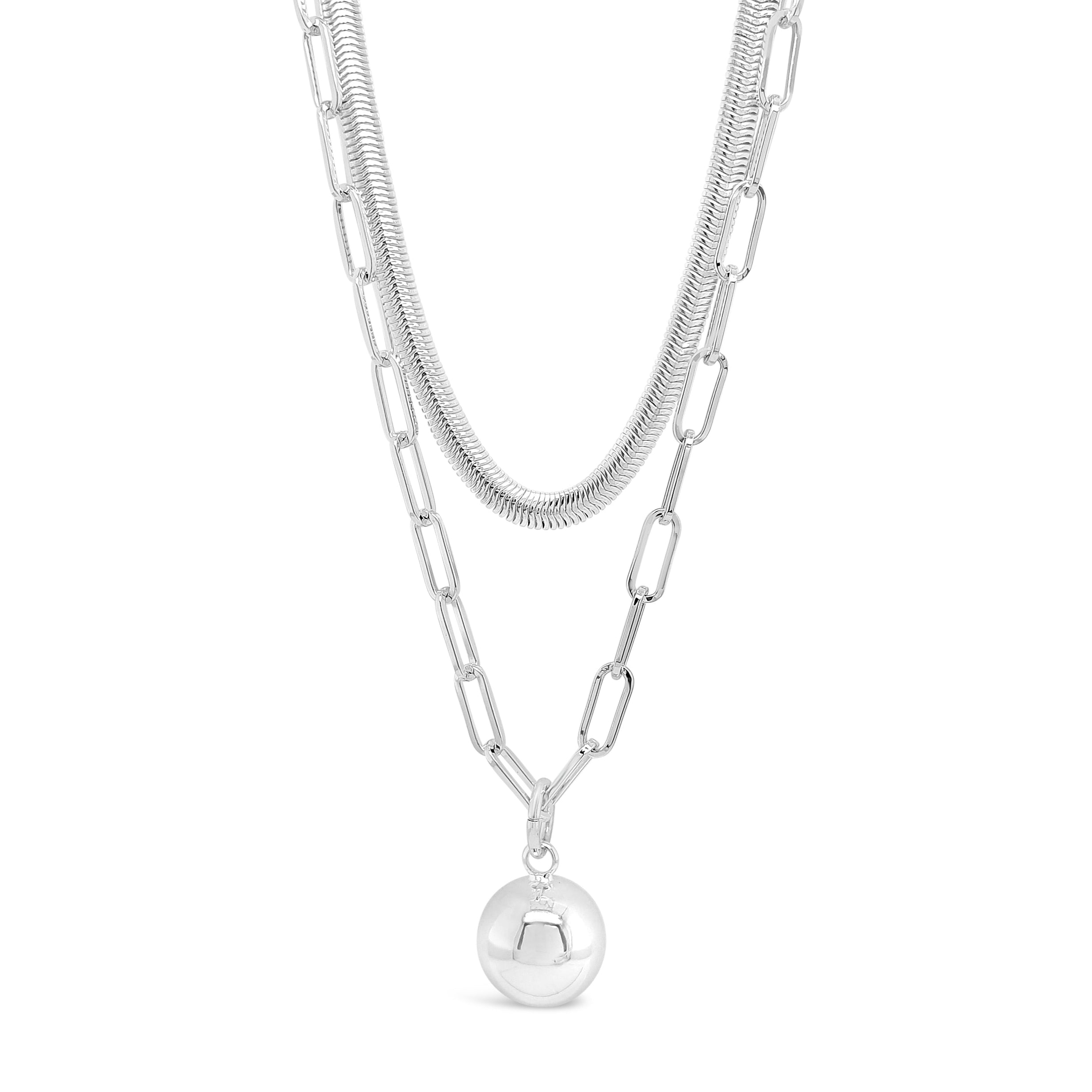 Description This elegant necklace combines a 16" flat snake chain with an 18" paperclip chain & round ball drop, designed...