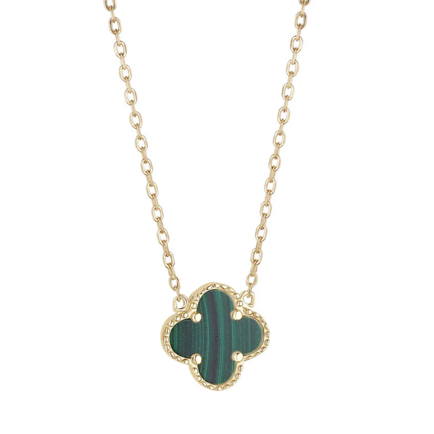 Description: This stunning necklace features a clover design with green malachite, plated in 18ct gold on sterling silver. Perfect for...