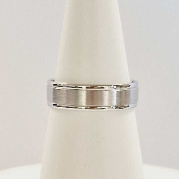 Description: Crafted with precision, this 6mm Sterling Silver Gents Band features a sophisticated matte silver center contrasted by polished glossy...