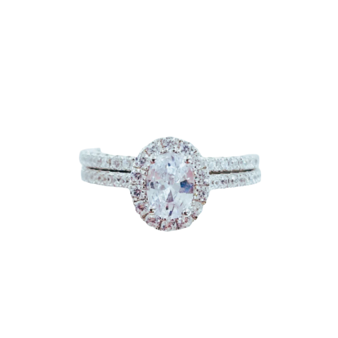 Description: This bridal set showcases an exquisite oval halo ring crafted from premium sterling silver, accompanied by a perfectly matched...