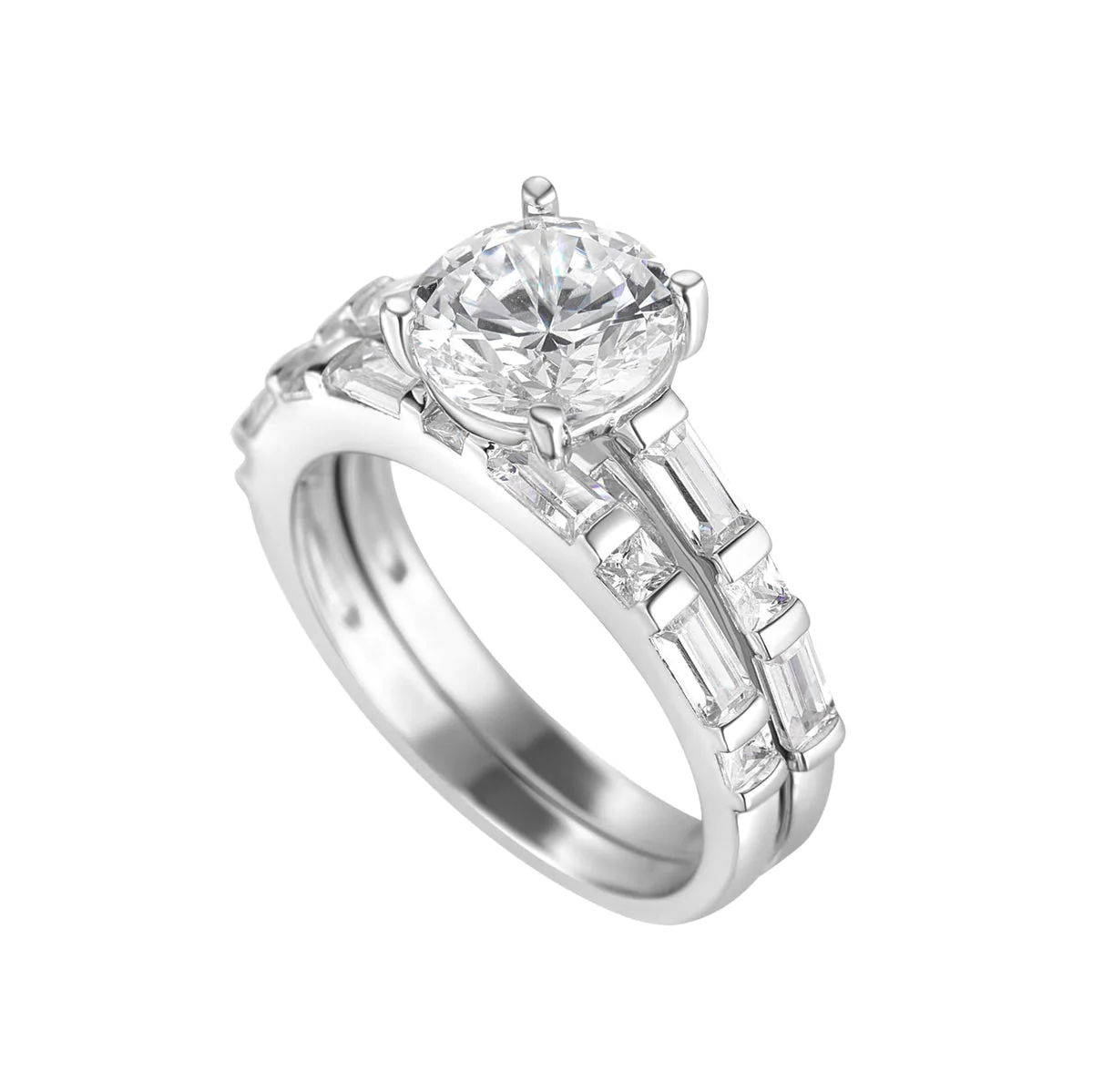 Description: This sophisticated wedding ensemble combines a striking solitaire cubic zirconia ring with an elegantly designed baguette-set cubic zirconia band....