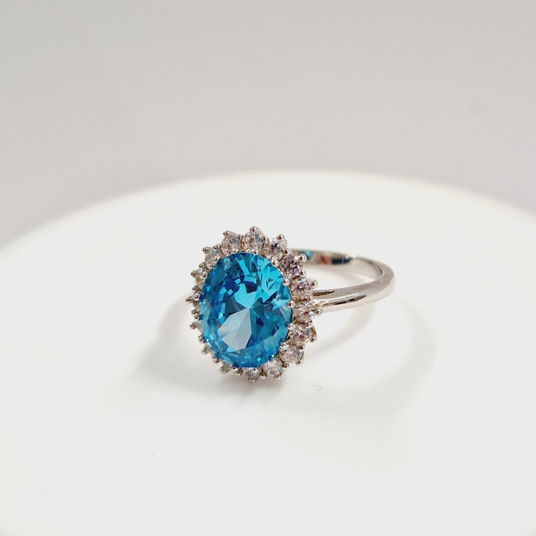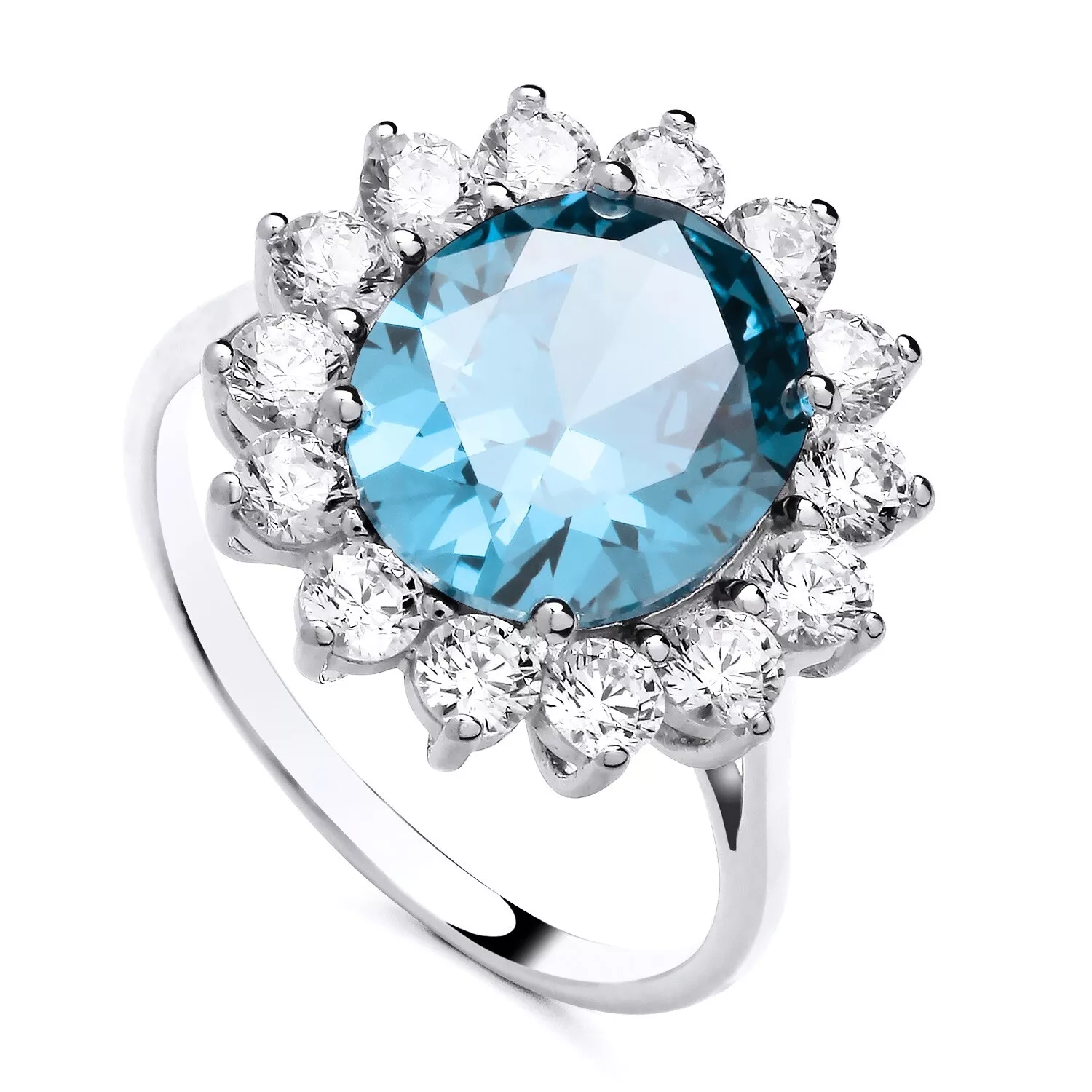 Description: Expertly crafted sterling silver cluster ring featuring a captivating aquamarine centerpiece that displays mesmerizing oceanic hues. The premium gemstone...