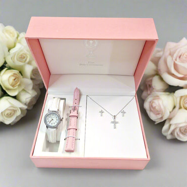 Communion Sterling Silver Sparkling Cross & Watch Gift Set with Pink Strap