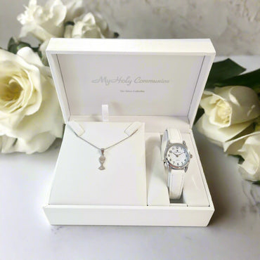 Description: This luxurious communion set features a dazzling sterling silver angel pendant and an elegant white leather strap watch. It...