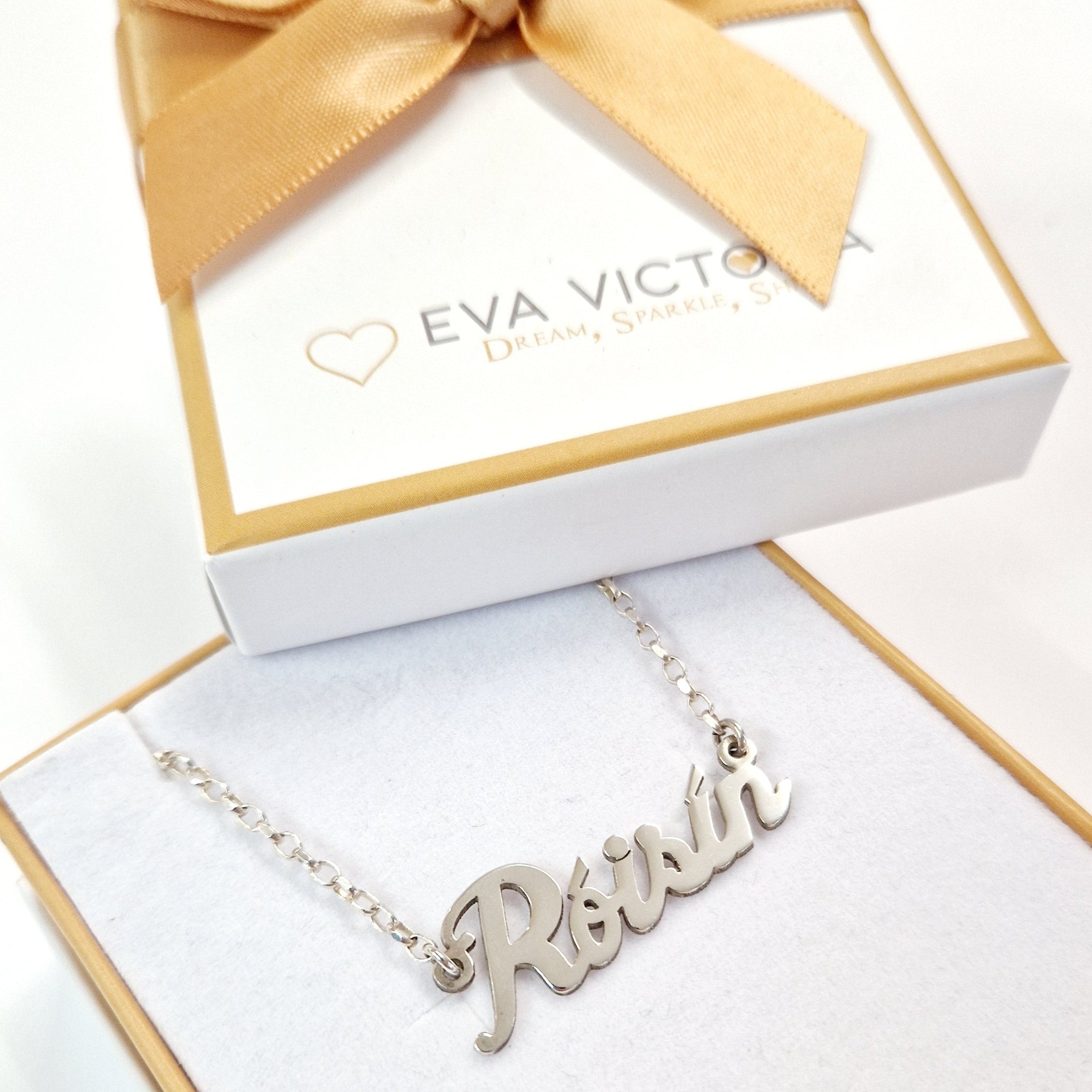 Design your own personalised sterling silver name necklace, crafted with care and attention to detail. Crafted in Ireland, Made from high-quality sterling silver, and plated in 18kt Gold if chosen. This custom necklace lets you wear a name, date or word that holds special meaning, whether it's your name, a loved one's, or an inspiring word that empowers you.