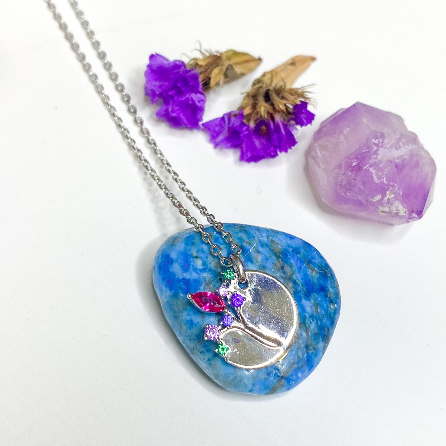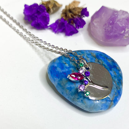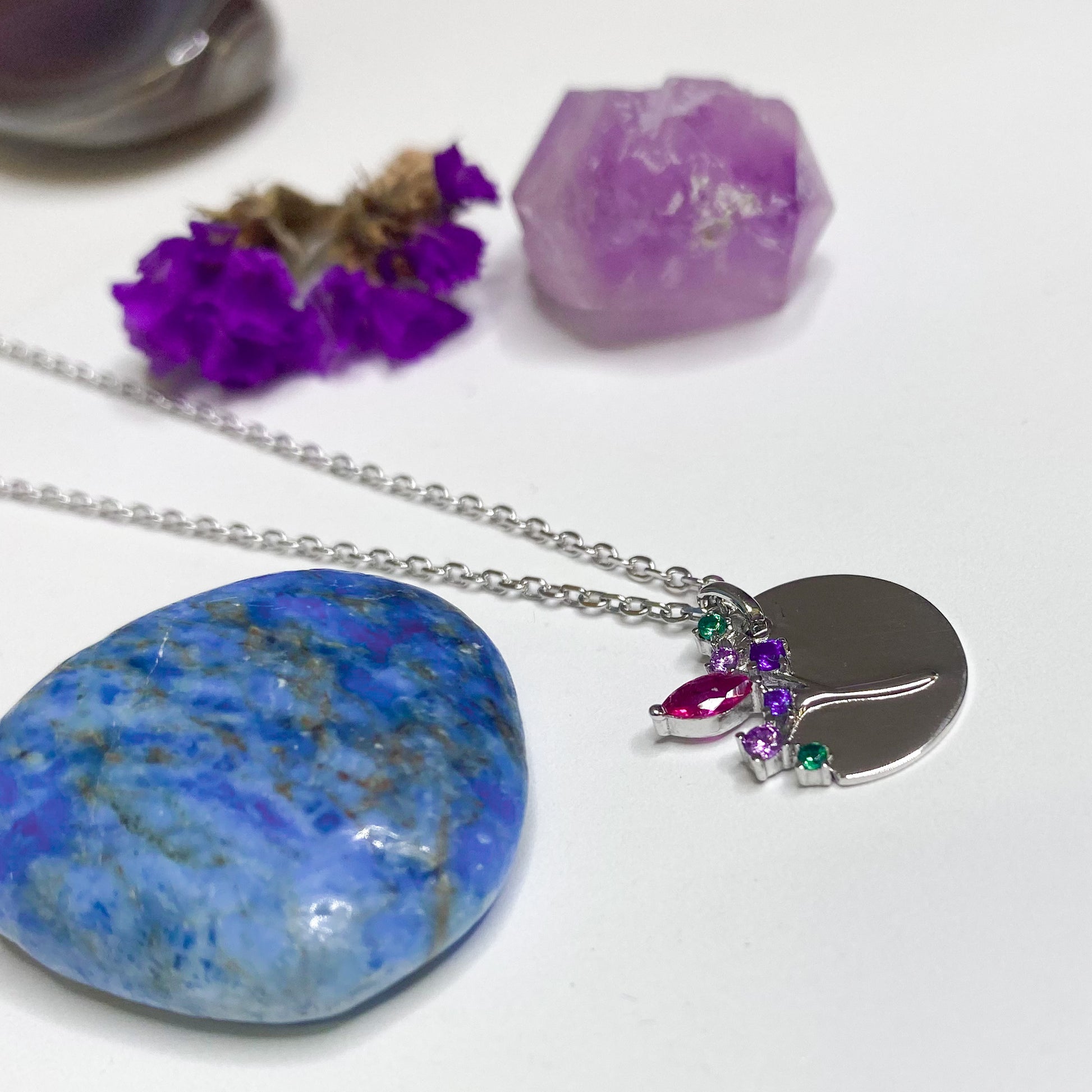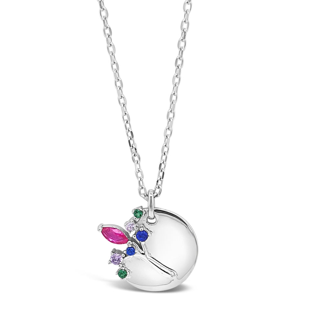 Crafted from 925 sterling silver, the Blossom Branch Multi Gem Disc Pendant boasts a stunning combination of sapphire, emerald, cubic zirconia, and pink ruby. With delicate detailing and vibrant colors, this piece is the perfect addition to any accessory collection.