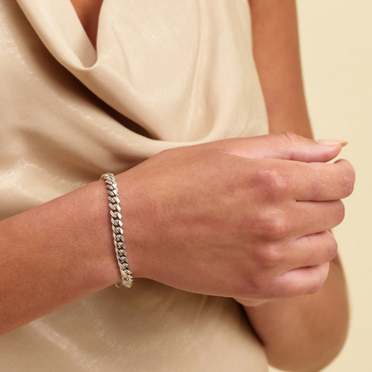 Crafted from high-quality sterling silver, this 5 mm Cuban curb chain bracelet offers a refined balance of durability and style. Its classic interlocking links provide a sleek, polished look perfect for both everyday wear and special occasions. Designed with expert precision, this bracelet ensures lasting comfort and a timeless appeal that complements any outfit.