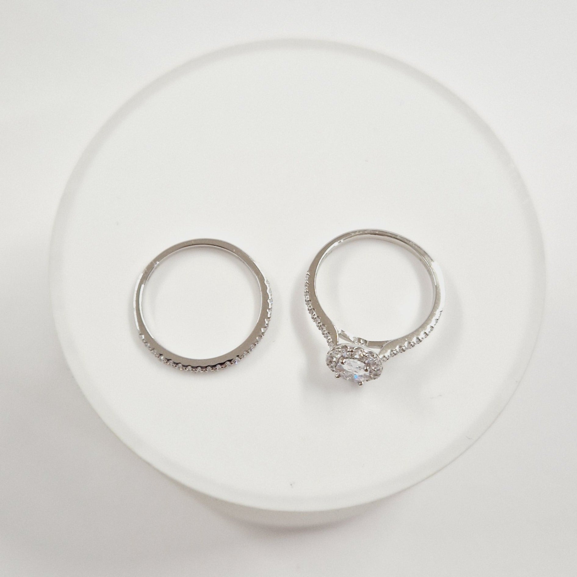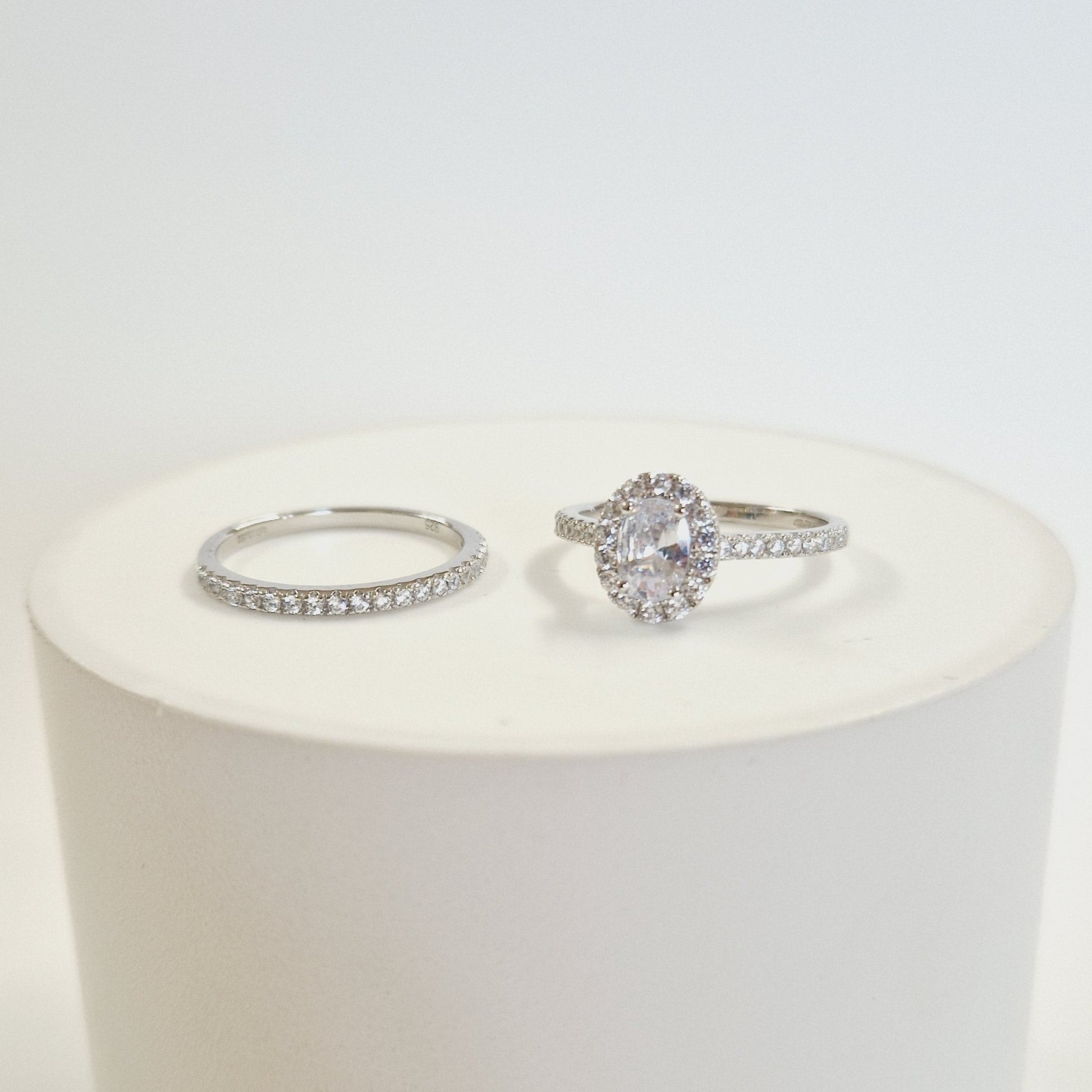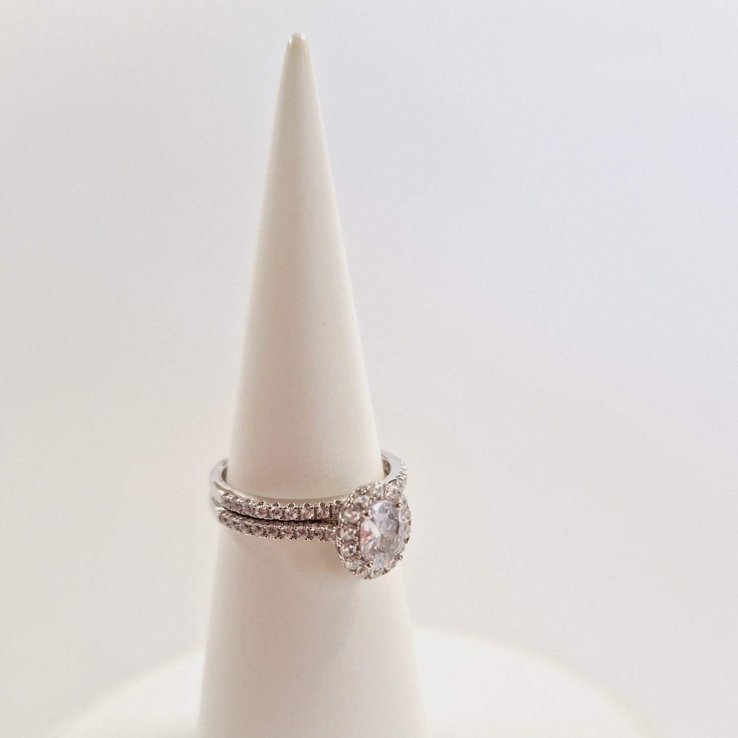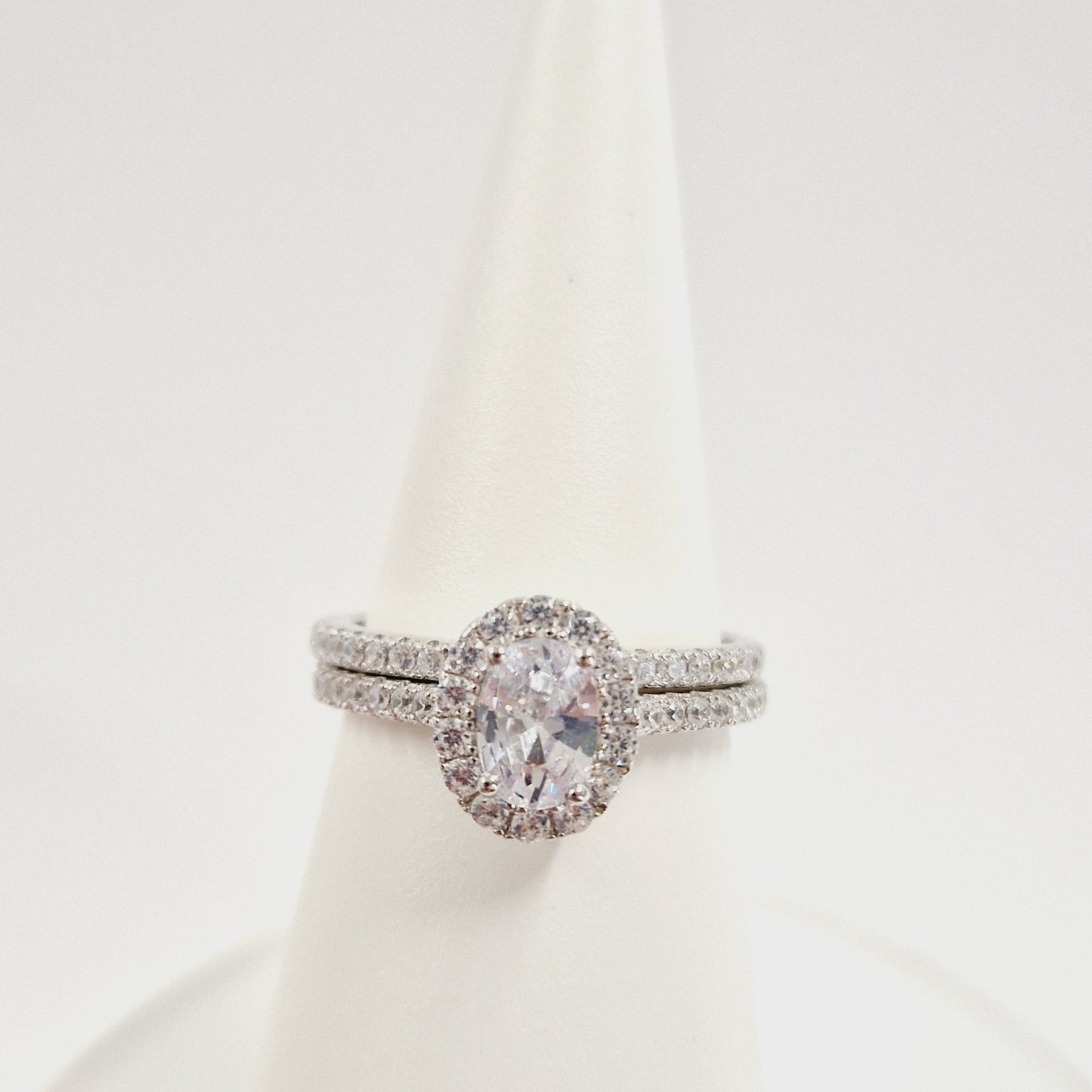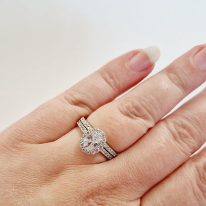 This bridal set showcases an exquisite oval halo ring crafted from premium sterling silver, accompanied by a perfectly matched delicate band. Both pieces feature meticulously set cubic zirconia stones that capture and reflect light with remarkable brilliance. The precision-cut stones are secured in a professional setting that enhances their clarity and sparkle, creating a sophisticated alternative to traditional diamond rings. The durable sterling silver construction ensures lasting beauty while maintaining an accessible price point for couples.
