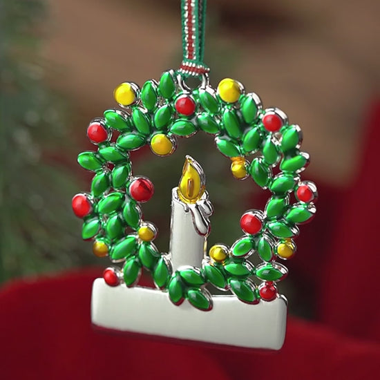 Add a touch of timeless tradition to your Christmas tree this year with this silver plated Wreath with Candle decoration. Featuring a detailed green coloured wreath accented with red and yellow and the glow of the golden candle light, a symbol of peace and welcome. Suitable for personalisation this decoration is a great gift for those who love the tradition of classic Christmas celebrations.