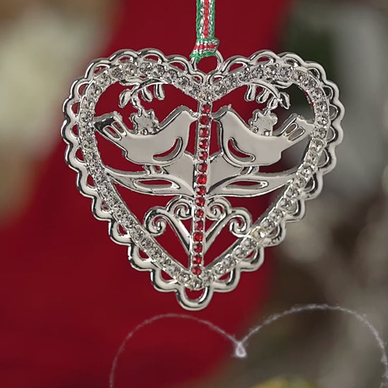Celebrate the season of love and togetherness with this elegant Love Birds Christmas tree decoration from Newbridge Silverware. Featuring two silver plated detailed birds nestled side by side within a heart border, this heartwarming piece symbolizes love, unity and joy. Adorned with glittering accents of clear and red crystal stone settings this decoration is suitable for personalisation making it the perfect gift for couples, newlyweds, or anyone who cherishes love and connection this holiday season.