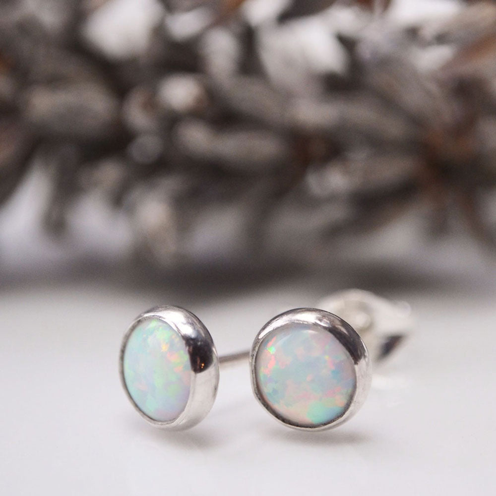 These elegant sterling silver stud earrings are perfect for everyday wear, featuring dazzling white opal. They are suitable for all ages and add a touch of sparkle to any outfit.