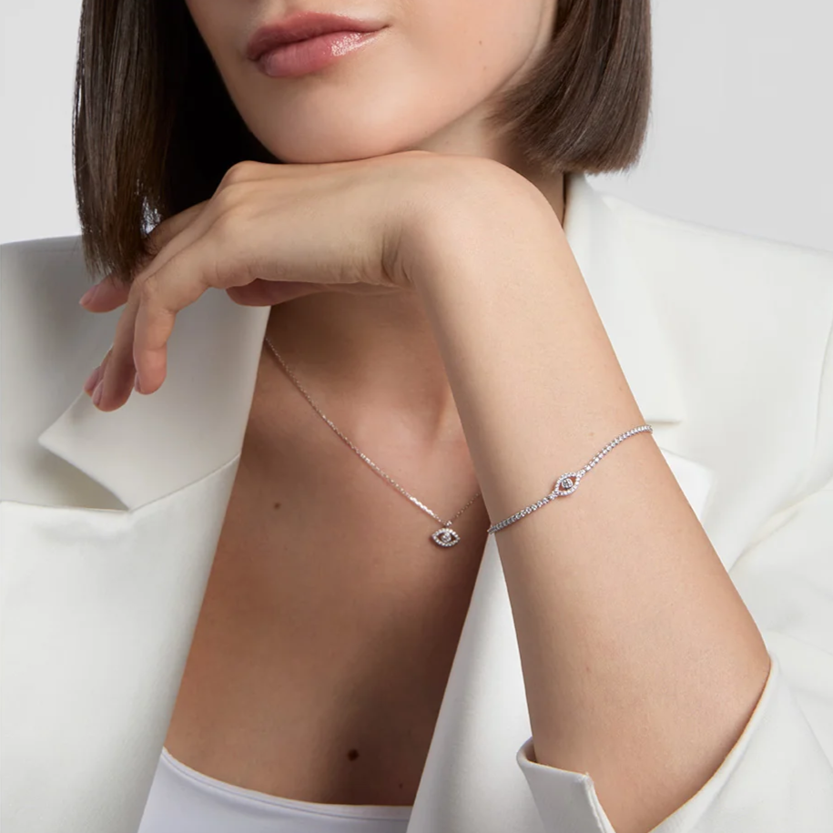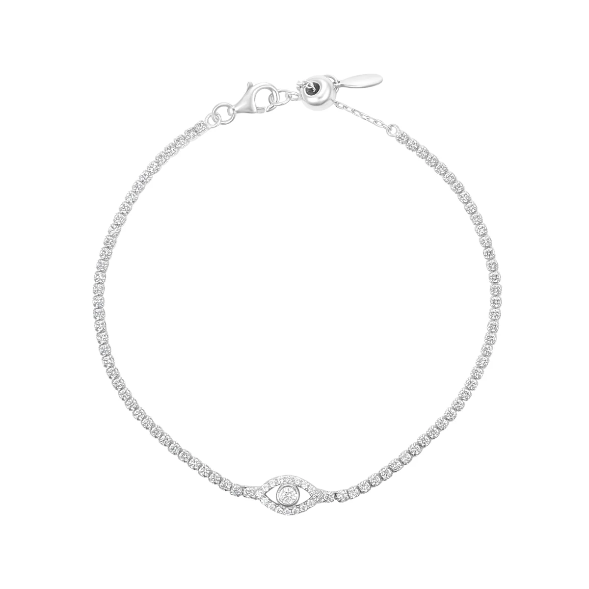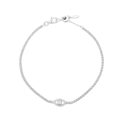 A modern take on a classic tennis bracelet, this sterling silver bracelet features an evil eye and is adorned with cubic zirconia. Believed to shield against jealousy and misfortune, the evil eye is a powerful symbol incorporated into this stylish piece.