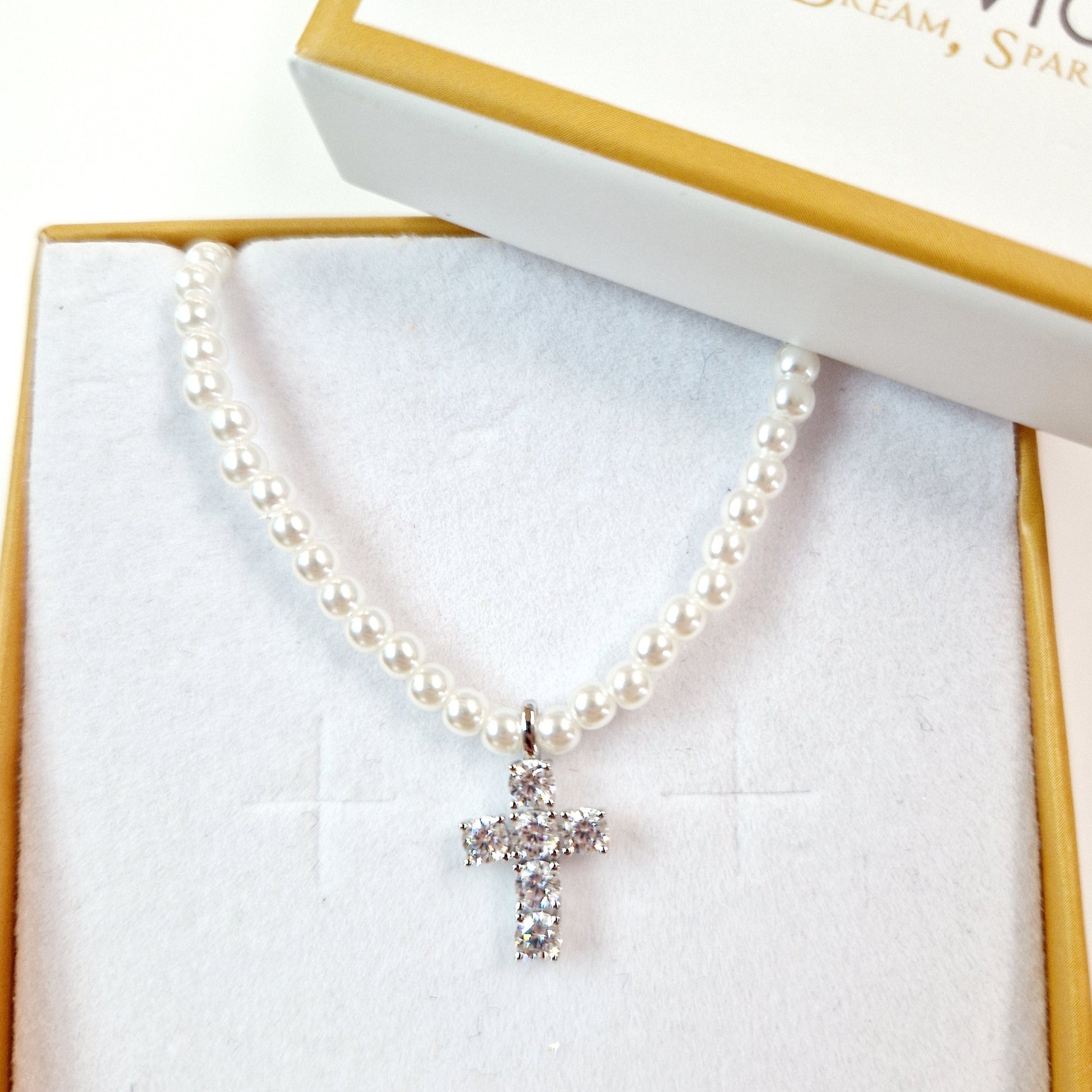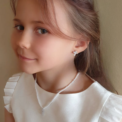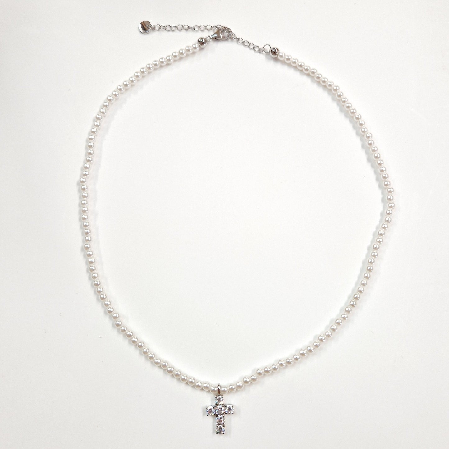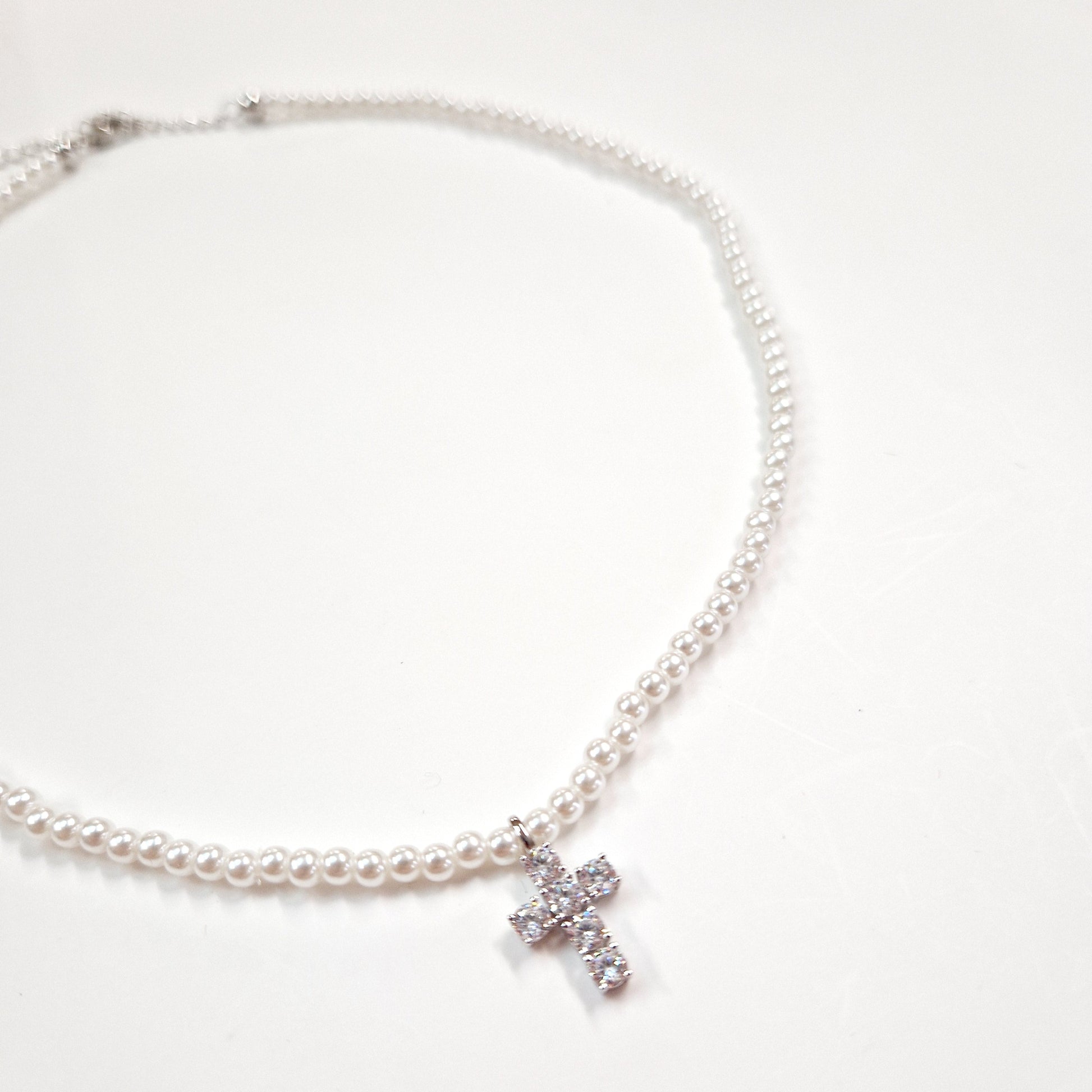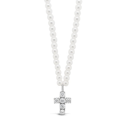 Sterling Silver Sparkling Cross on White Pearls Necklace