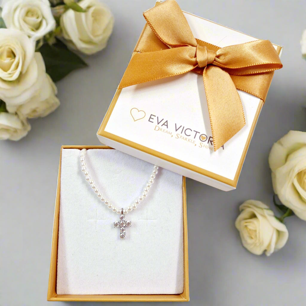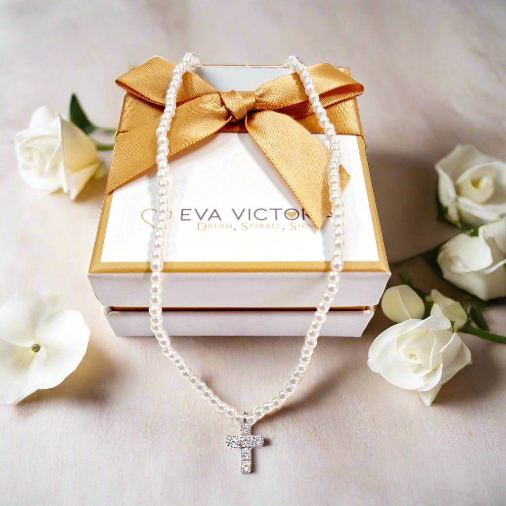 This stunning sterling silver cross is set on a white pearls necklace, with a 16-inch chain that can be extended to 18 inches. This elegant accessory serves as both a fashion statement and a powerful symbol of one's religious devotion.